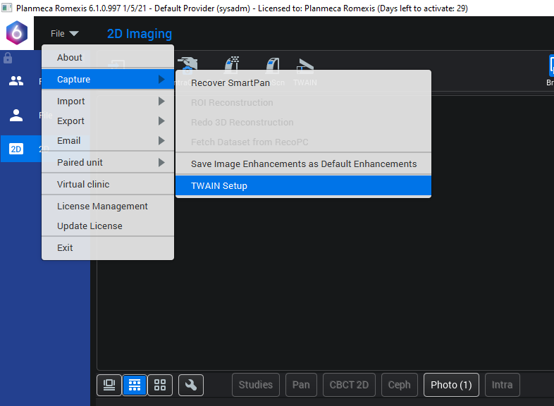3. When inside of Romexis, go to the 2D Imaging with a patient selected. Click on File, Capture and then Twain Setup.