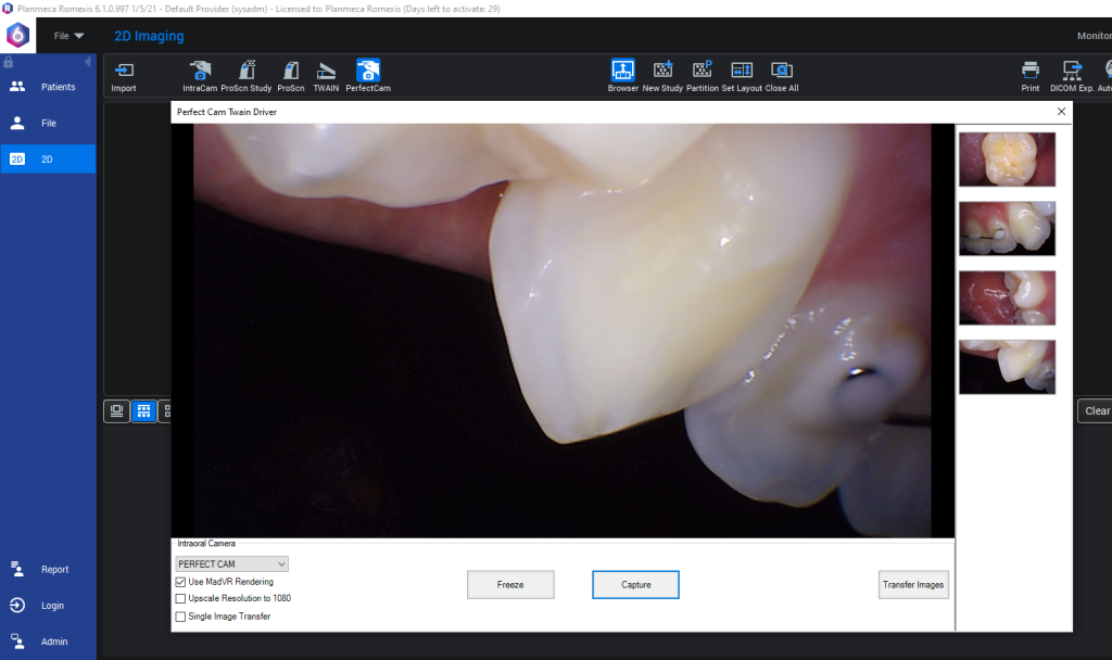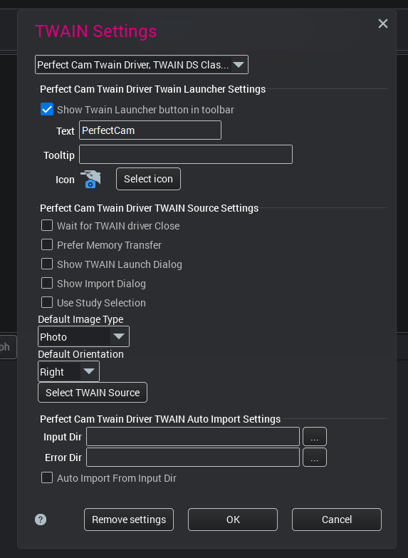4. Select Perfect Cam Twain Driver in the drop down box. Checkmark Show Twain Launcher button in toolbar and make the Text PerfectCam. Set an icon as Intraoral Camera. The Default Image Type should be Photo. Click Okay. Restart Romexis.